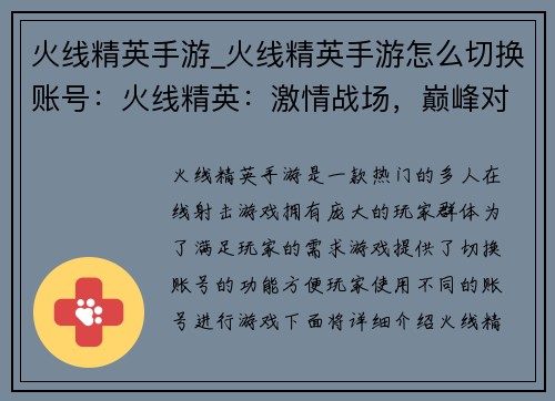 火线精英手游_火线精英手游怎么切换账号:火线精英:激情战场,巅峰对决